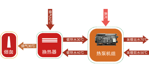 天然氣經燃氣鍋爐燃燒后,產生的煙氣,進入煙氣余熱深度回收機組,深度回收煙氣中的熱量使排煙溫度大幅度降低,回收的熱量用于加熱熱網回水或直接供熱。 | 燃煤鍋爐燃燒產生的煙氣經濕法脫硫后進入換熱器,深度回收煙氣中的潛熱與顯熱并降低污染物的排放,使鍋爐的排煙溫度大幅降低,回收的熱量用于加熱熱網回水或直供。 | |